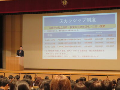オープンキャンパスとは違った本校の詳しい説明と、入試の概要や入試情報についてのお話をさせていただいております。